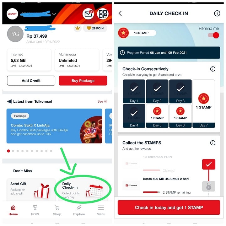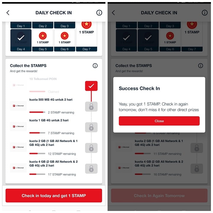 Caranya pun cukup mudah, kalian hanya perlu menggunakan aplikasi Mytelkomsel dan melakukan Check in setiap hari selama masa promo bagi-bagi kuota internet ini. Tujuannya adalah mengumpulkan Stamp sampai dengan 30 buah Stamp.