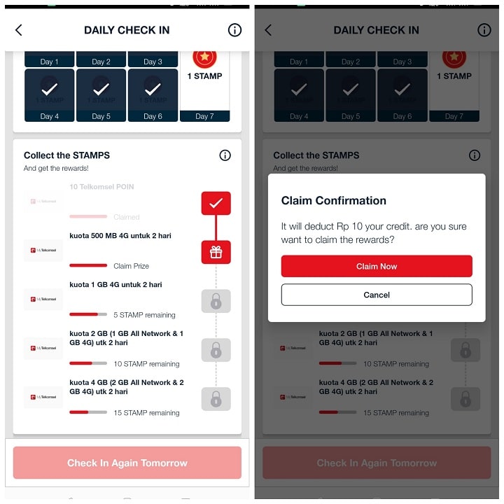 Setelah stamp mencukupi untuk setiap reward, icon berubah menjadi icon kado. Dan kalian bisa mulai klaim reward (seperti pada gambar). Setiap reward yang di klaim akan menggunakan pulsa Rp 10. Jadi total dibutuhkan pulsa Rp 70 ( 7 x Rp10).